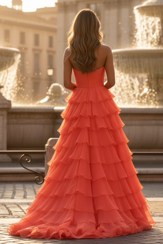 Red Strapless Long Tiered Ruffle A-line Prom Dress