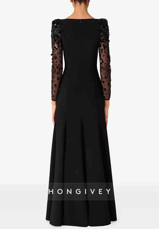 Bateau Neck Long Sleeves Back Zipper Floor-Length Evening Gowns
