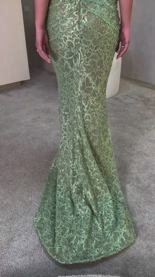 Sparkly Sage Beaded Floor-Length Pleated Trumpet Prom Dresses