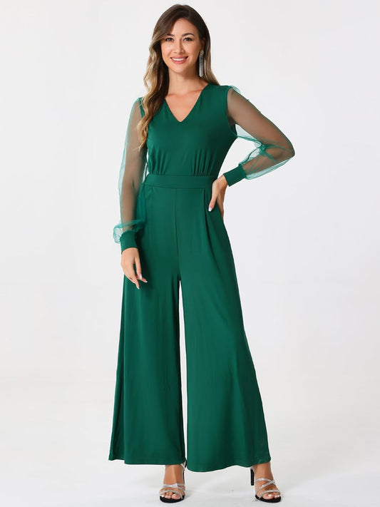 Elegant V Neck Mesh Long Sleeve Loose Wide Leg Romper Party Jumpsuits