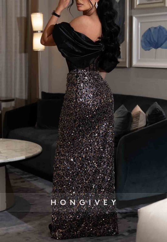 Sheath Off the Shoulder Black Sequined Evening Gowns with Side Slit
