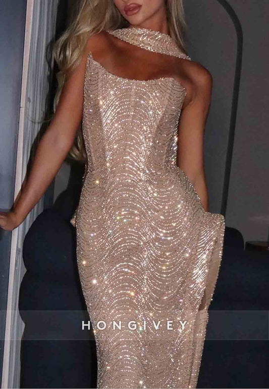 Side Slit Strapless Prom Dresses Glitter Sheath Floor-Length Prom Dresses