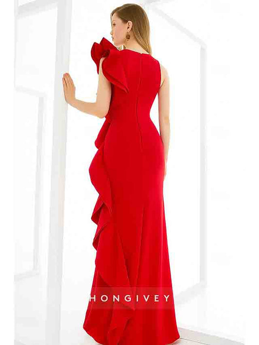 Black One-Shoulder Sculpted Ruffle Evening Dress