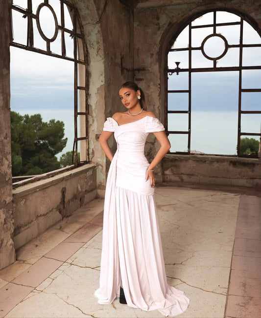 Asymmetric V-Neck Off-The-Shoulder Sleeveless Long A-Line Prom Dress With Pleated And Split