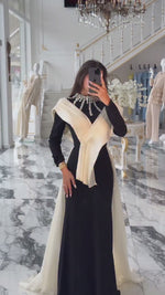 This elegant floor-length trumpet gown features long sleeves and delicate rhinestone embellishments, creating a refined silhouette that enhances your natural grace. Designed for formal occasions, its sleek fit and subtle sparkle offer a sophisticated blend of timeless style and modern allure, making it a perfect choice for memorable evenings.