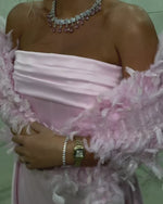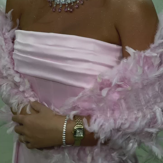 Embrace timeless elegance with this pink strapless satin gown, featuring a graceful sweep train and exquisite feather accents. The attached cape adds a dramatic touch, creating a sophisticated silhouette perfect for making a lasting impression at any formal occasion.