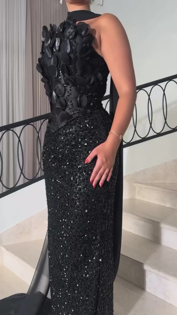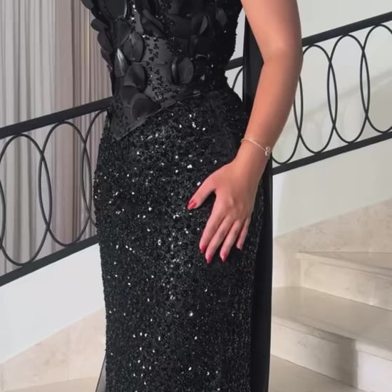 This black strapless sheath evening gown is exquisitely embellished with sparkly appliqués and sequins, delivering a subtle yet stunning radiance. Its sleek design contours the body for a flattering fit, perfect for making a poised and elegant statement at any formal event.