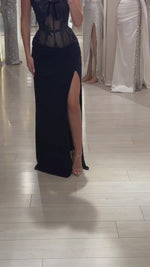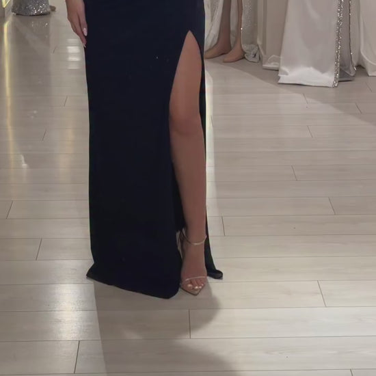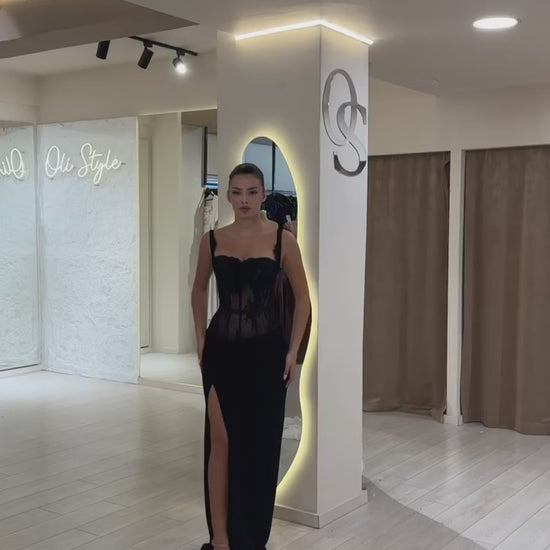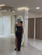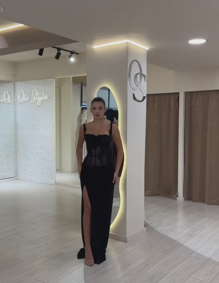 This black lace prom dress combines timeless elegance with modern style. Featuring regular straps and a sleek column silhouette, its floor-length design is complemented by a daring high slit for an effortless balance of sophistication and allure. Perfect for making a graceful statement at any formal event.