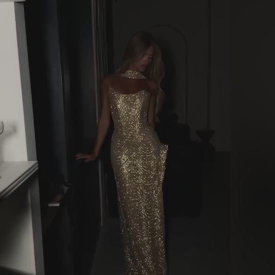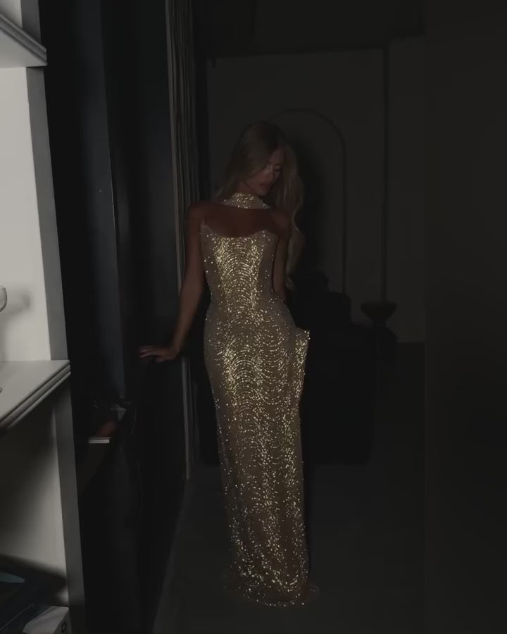 Make an unforgettable statement in this sleek sheath gown that epitomizes modern sophistication. Luminous glitter detailing adorns the floor-length silhouette, creating an ethereal shimmer that captivates without overwhelming the refined cut. The strapless neckline provides an elegant, uncluttered frame for the face and shoulders, while the streamlined sheath silhouette hugs the body beautifully. A tasteful side slit adds contemporary edge and allows graceful movement throughout the evening. This dress perfectly captures the essence of understated glamour, ideal for those who appreciate clean lines, subtle sparkle, and timeless elegance.