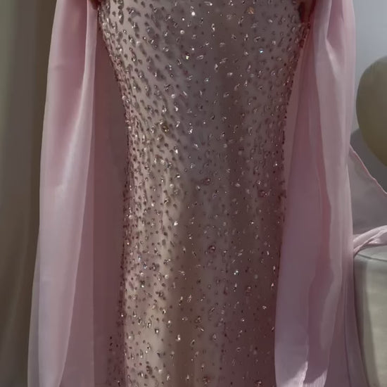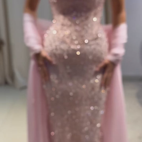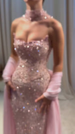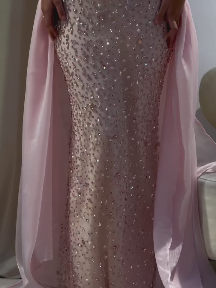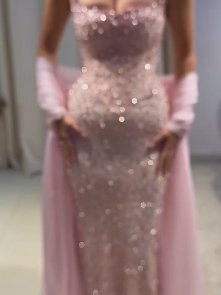 Make a splash at prom in this dazzling mermaid gown! The strapless neckline and floor-length silhouette create an elegant, show-stopping look, while thousands of shimmering rhinestones catch the light with every twirl. The fitted bodice flows into a dramatic fishtail hem that's perfect for those unforgettable red carpet moments. Whether you're dancing the night away or posing for photos, this sparkly stunner ensures all eyes are on you. Your fairy tale evening starts here!