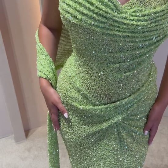 This sophisticated green mermaid dress features a glitter knit fabric with elegant pleating and an asymmetrical shoulder design. Its flattering silhouette enhances your curves while the subtle shimmer adds refined glamour. Perfect for formal events, this dress combines modern style with timeless elegance.