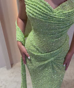 Mermaid Green Glitter Knit Asymmetrical Shoulder Pleated Prom Dresses