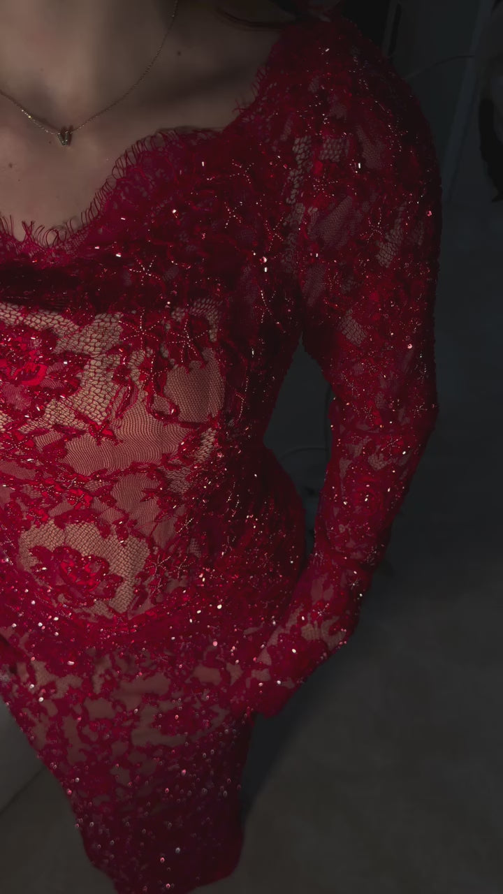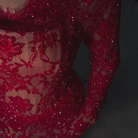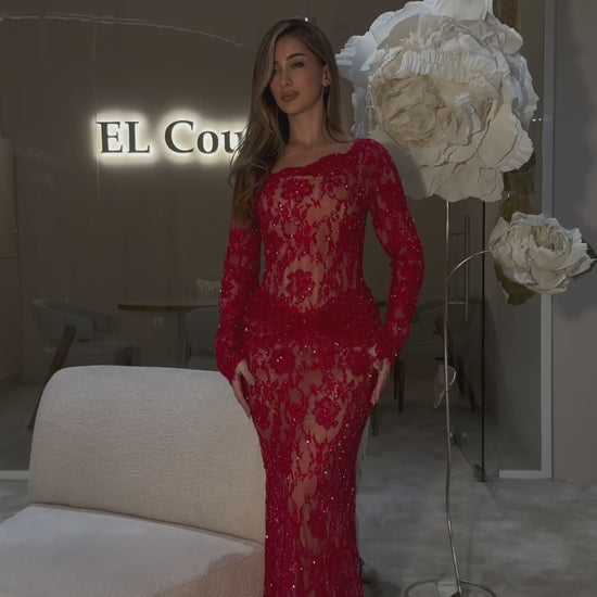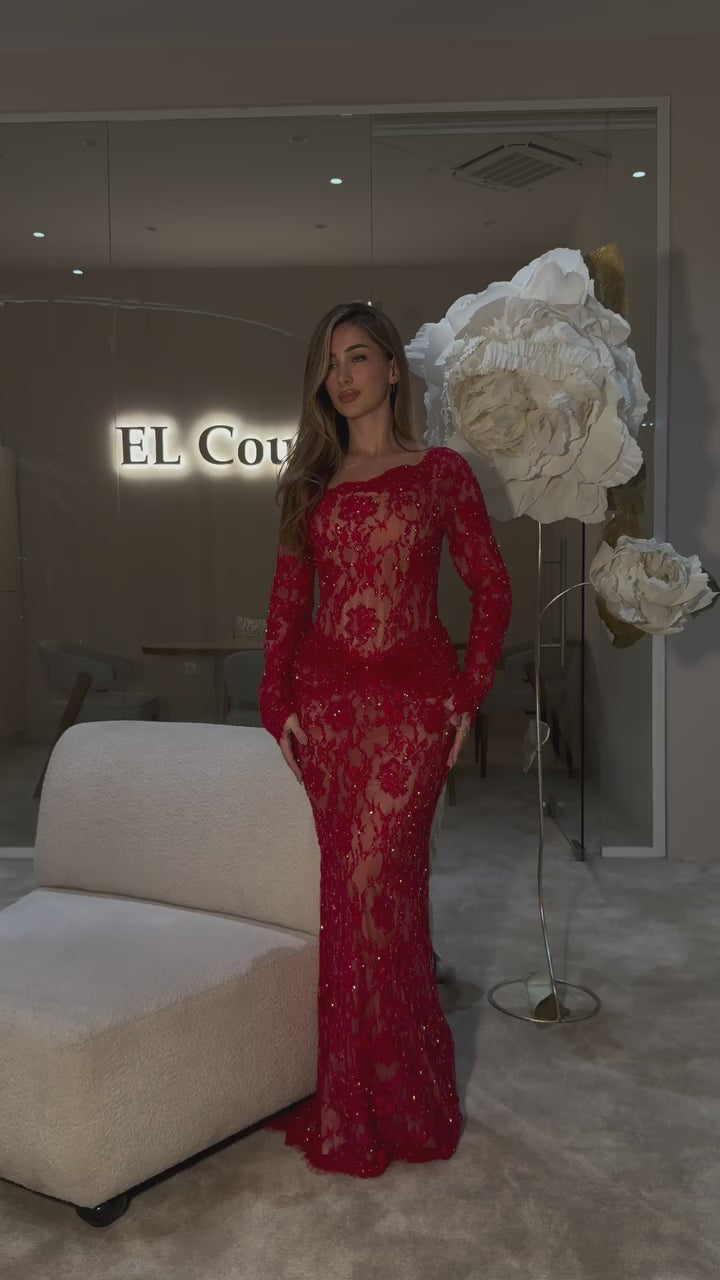This red floor-length mermaid dress features intricate lace detailing and elegant long sleeves, enhanced by delicate beadwork that adds refined sparkle. Designed to accentuate your silhouette, it embodies timeless sophistication and grace for unforgettable formal occasions.