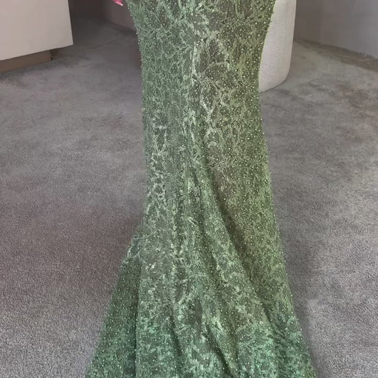 Sparkly Sage Beaded Floor-Length Pleated Trumpet Prom Dresses