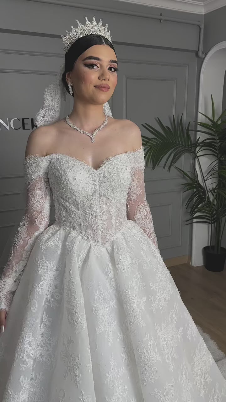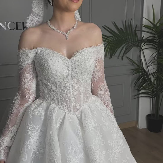 Step into your fairy tale moment with this enchanting princess wedding dress. Adorned with intricate lace and lustrous pearls, the off-the-shoulder design with long sleeves exudes timeless sophistication. The voluminous skirt creates a regal silhouette that captures the essence of bridal grandeur. Every detail—from the delicate pearl embellishments to the flowing fabric—speaks to refined elegance, making this gown the perfect choice for a bride who desires both romance and understated luxury on her wedding day.