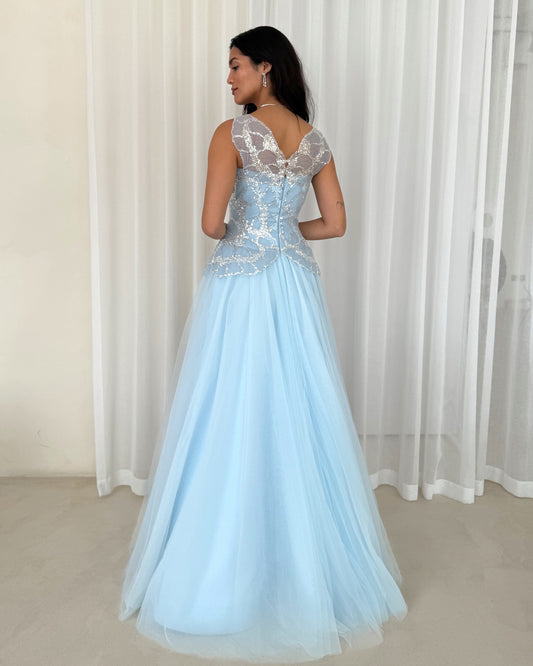 V-Neck Sleevless Blue Lace Sequins Sparkle Tulle A-Line Evening Dress