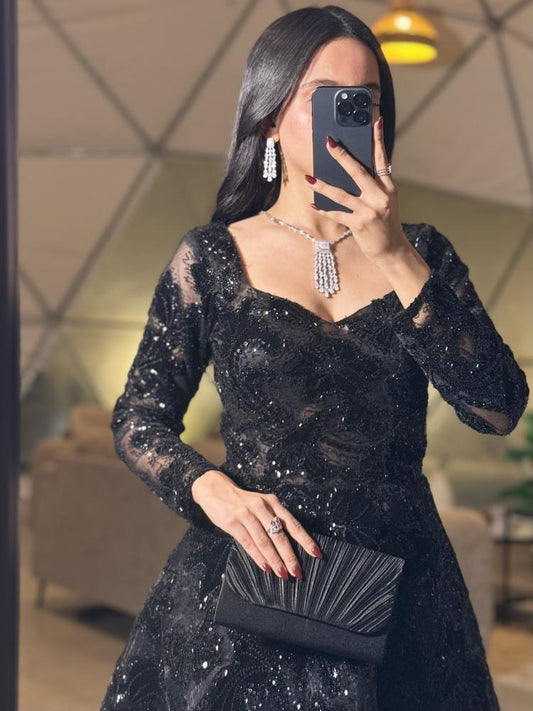Black Square Neck Beaded Sequins Sparkle Long Sleeve A-Line Evening Dress