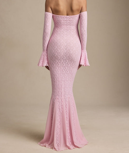 Elegant Pink Off the Shoulder Lace Long Sleeve Mermaid Evening Dress Floor-Length