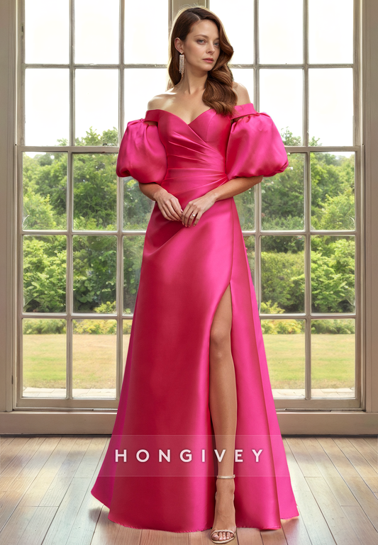Satin A-Line Off-Shoulder Detachable Puff Sleeves Mother of the Bride Dress