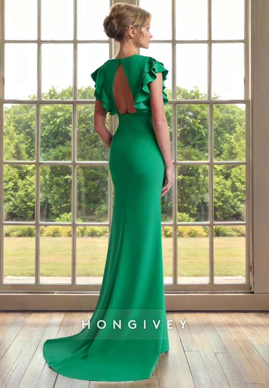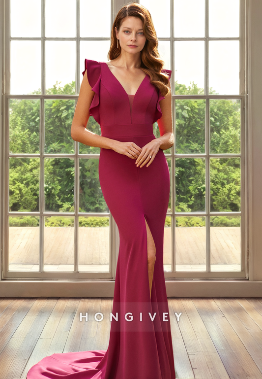 Chic Trumpet V-Neck Ruffled With Slit Mother of the Bride Dress