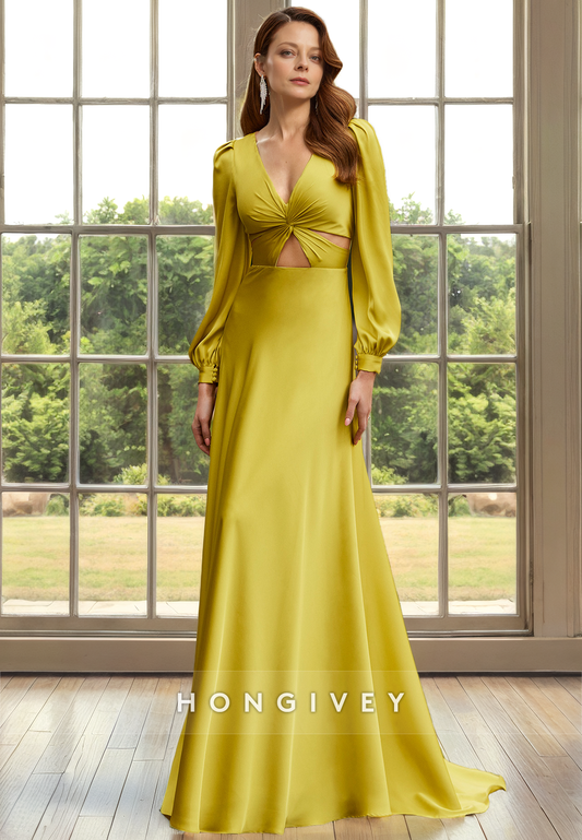 Chic Satin A-Line V-Neck Long Sleeve Mother of the Bride Dress