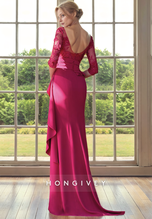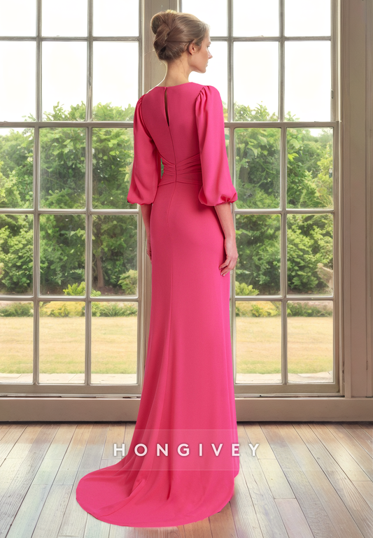Satin Trumpet V-Neck 3/4 Sleeves Pleats With Side Slit Mother of the Bride Dress