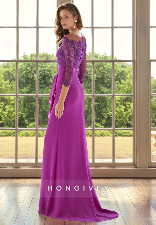 Chic Satin Scoop 3/4 Sleeves Beaded Lace Applique Mother of the Bride Dress