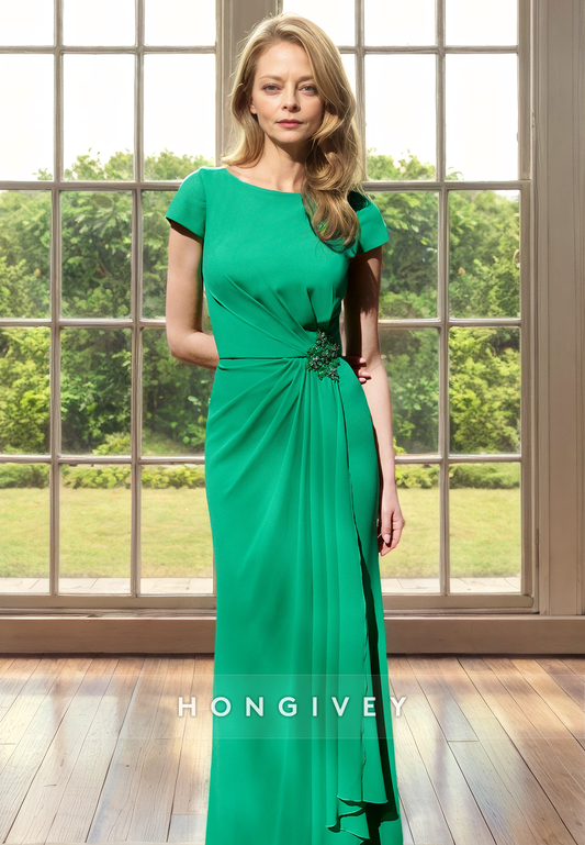 Satin Fitted Scoop Ruffled With Slit Mother of the Bride Dress