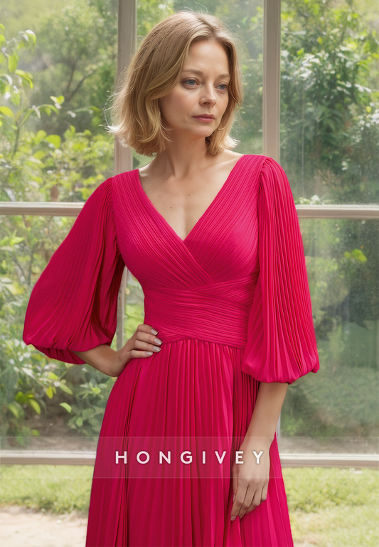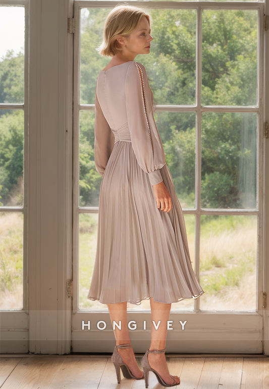 HONGIVEY Chiffon Long Sleeves Mother of the Bride V-Neck A-Line Dress Midi Dresses
