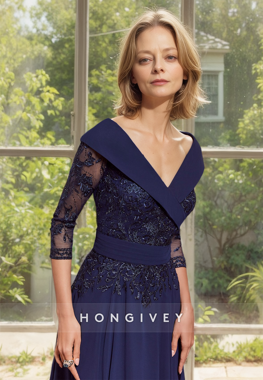 HONGIVEY Elegant Lace Applique Half Sleeves V-NeckA-Line Mother of the Bride Dress