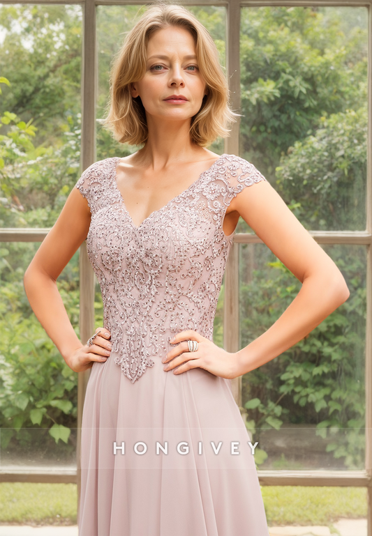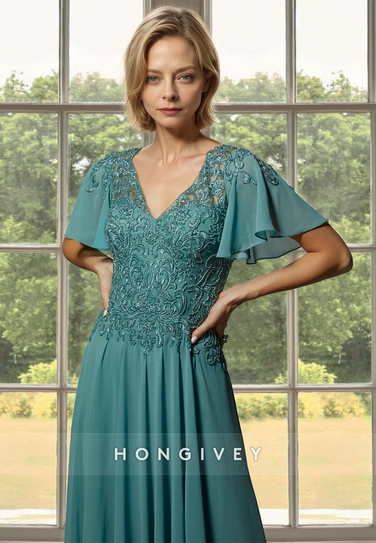 V-Neck Applique Short Sleeves A-Line Chiffon Long Mother of the Bride Dress