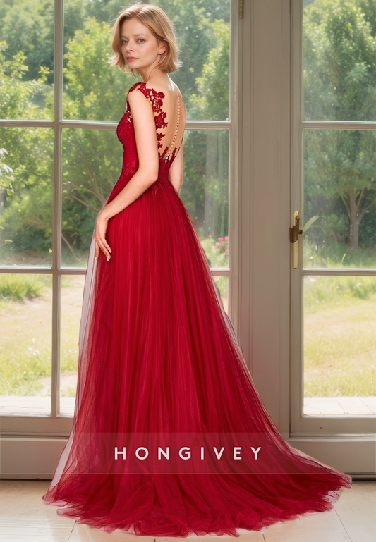 HONGIVEY Red V-Neck Backless Tulle Wedding Guest Gown Side Slit Floor Length Dress