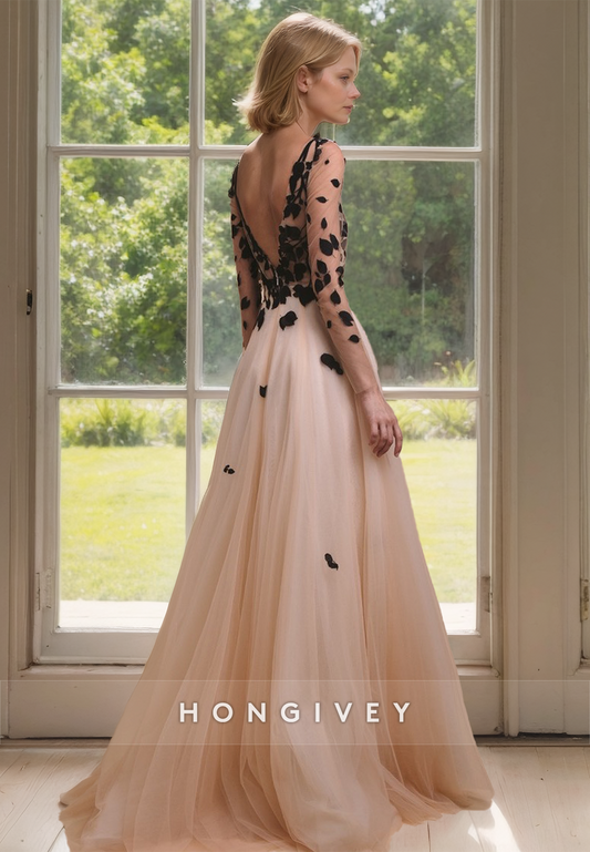 HONGIVEY Tulle A-Line Mother of the Bride Dress Sleeves Applique Long Wedding Guest Gown