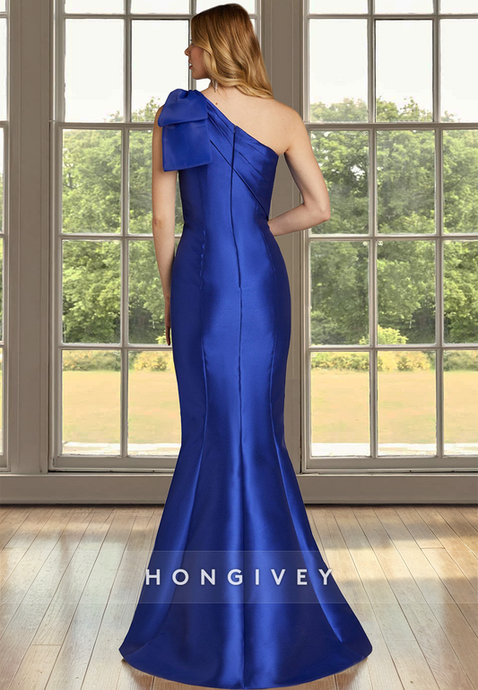 One Shoulder Fitted Trumpet Blue Satin Mother of the Bride Wedding Guest Dress
