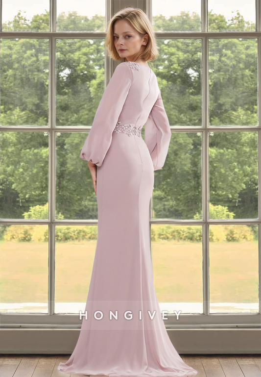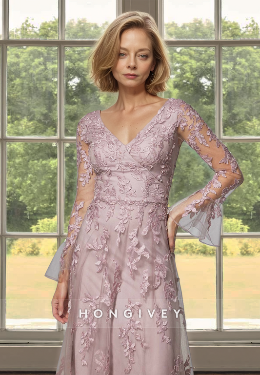Applique Trumpet Sleeves Elegant Long Mother of the Bride Wedding Guest Dress