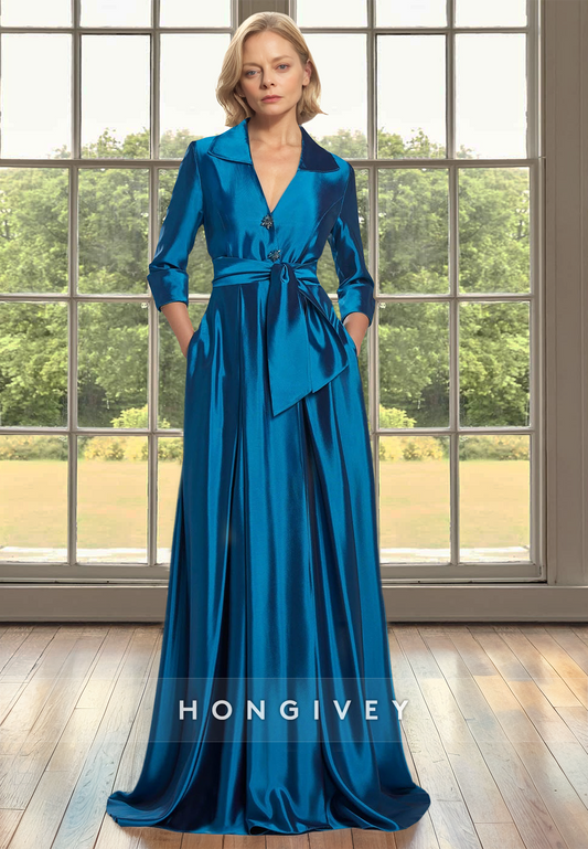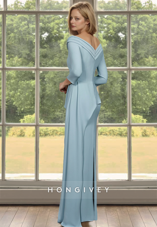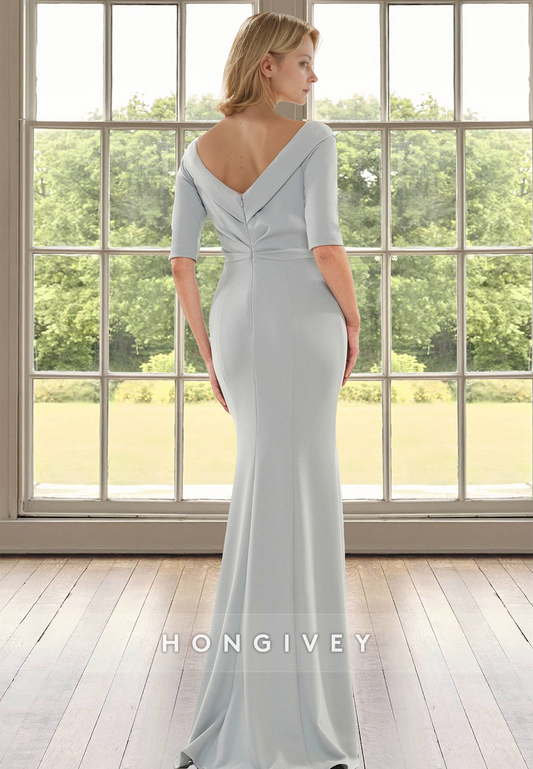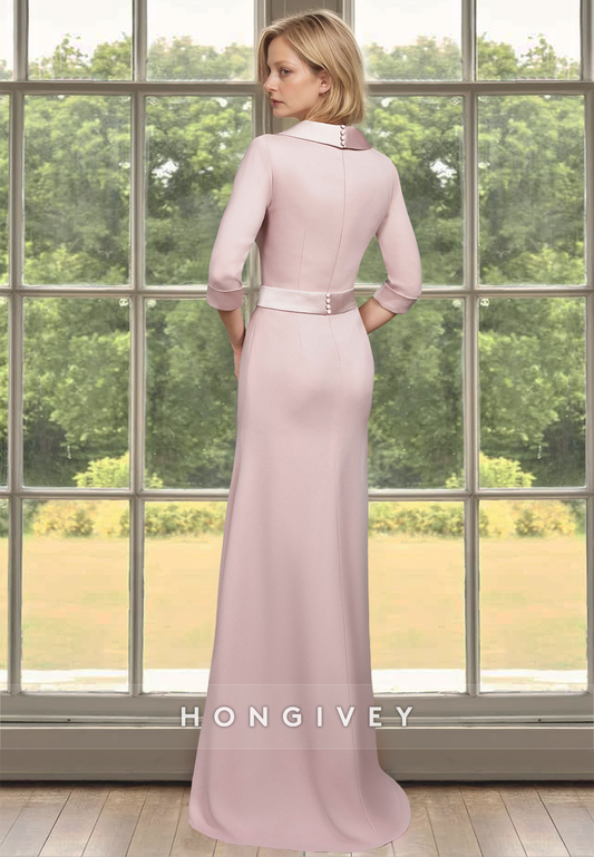 Half Sleeves Floor-Length A-Line Satin with Slit Mother of the Bride Wedding Guest Dress