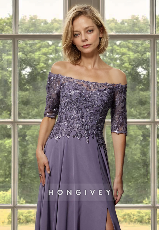 HONGIVEY Half Sleeves Mother of the Bride Dress Lace Applique Long Wedding Guest Gown