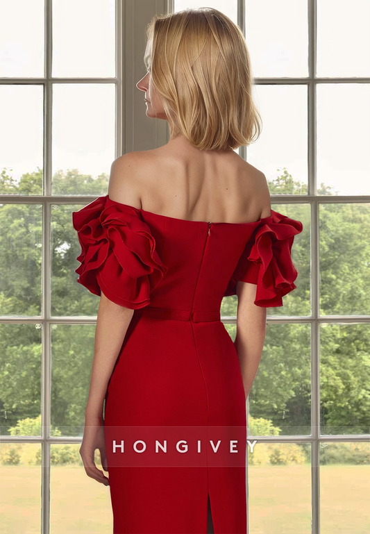 HONGIVEY Lace Mermaid Wedding Guest Gown Off-Shoulder Backless Red Sexy Formal Dress