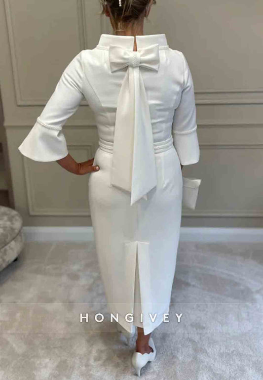 Bowknot 3/4 Sleeve Cocktail Dresses Tea-Length Sheath Mother of the Bride Dress