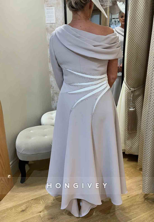 Off the Shoulder Sheath Mother of the Bride Dress Tea-Length Pleated Evening Gown