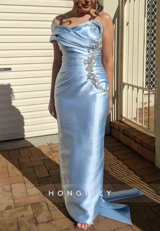 Satin Appliqued Bowknot V Back Column Floor-Length One Shoulder Mother of the Bride Dresses