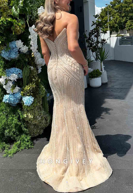 Strapless High Slit Beading Floor-Length Trumpet Sleeveless V Back Mother of the Bride Dress