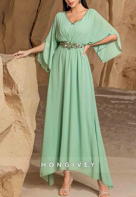 Round Neck Bell Sleeves Ankle-Length Beaded Long Mother of the Bride Dress