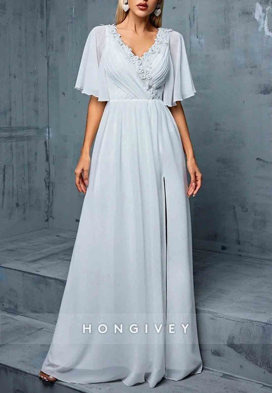 High Slit V-Neck Tie Back A-line Flutter Sleeves Flowers Mother of the Bride Dress