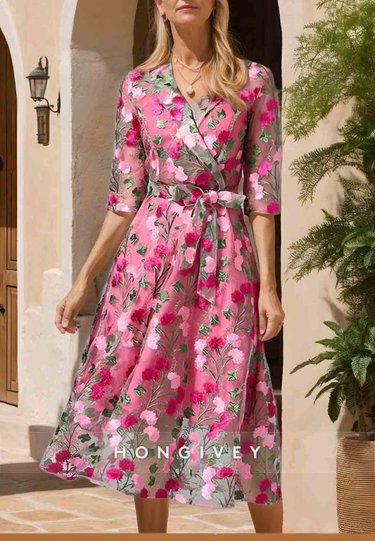 Half Sleeve Flowers V Neck Tea-Length A-line Mother of the Bride Dress