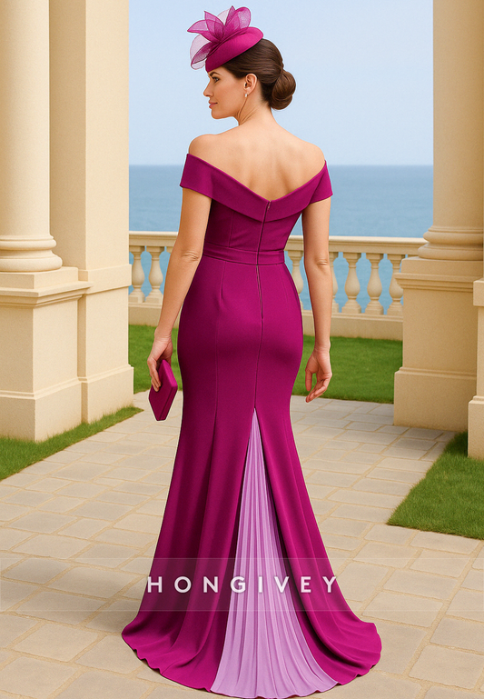 Off the Shoulder Purple Sweep Train Trumpet Mother of the Bride Dress with Ruffles