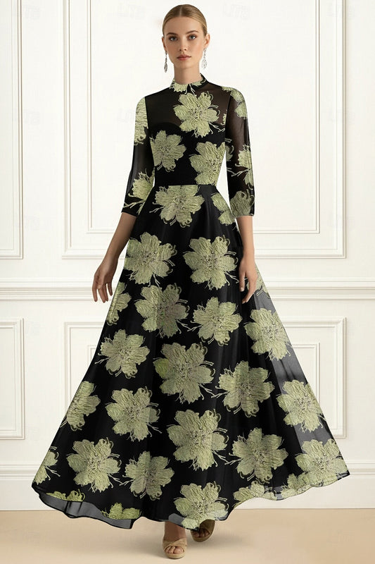 Floral Print Flowers 3/4 Sleeve A-Line Floor-Length Formal Evening Dress