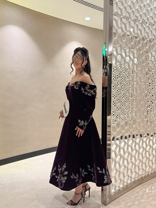 Elegant Black Off the Shoulder Long Sleeve Flowers Applique A-Line Ankle-Length Evening Dress