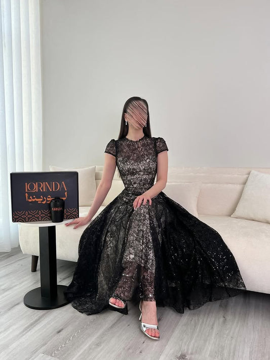 Black O-Neck Half Sleeve A-Line Backless Ankle-Length Evening Dress