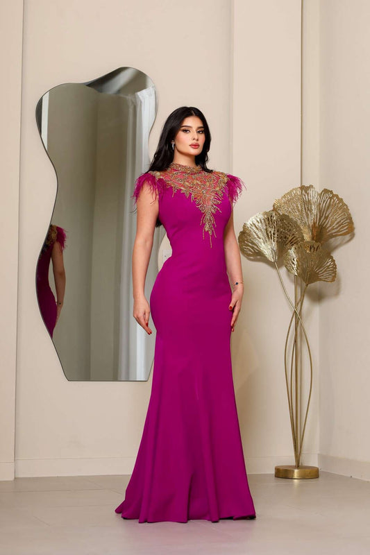 Fashion High Neck Sleeveless Beaded Applique Feather Mermaid Evening Dress